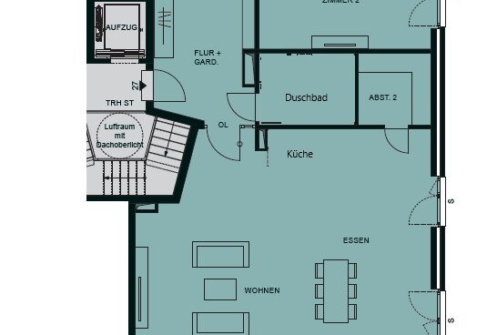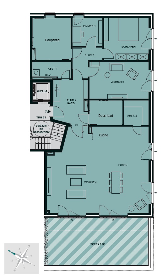 Ein besonderes Highlight ist der großzügige Wohn- und Essbereich, der dank seiner bodentiefen Fenster in warmes Tageslicht getaucht wird. Von hier aus öffnet sich der Zugang zur weitläufigen Dachterrasse mit Blick auf die Kanaltrave und die historische Silhouette der Lübecker Altstadt. Mit einer Fläche von über 40 m² schenkt diese Ihnen zusätzlichen Raum für entspannte Stunden unter freiem Himmel. Hier genießen Sie eine besondere Atmosphäre, die das Wohnen im Staffelgeschoss so einzigartig macht.